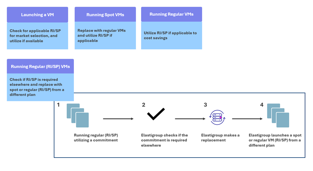 As part of the revert to commitments process, Elastigroup utilizes RI/SP as a wrapper for a regular VM if applicable to cost savings.